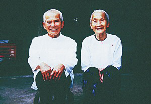 當(dāng)我來到時(shí),老人已經(jīng)入殮。我借機(jī)打量傣家這從不許外人參觀的、全家?guī)状硕妓诶镞叺纳衩氐呐P室。只見臥室是一個(gè)通廊,里邊一長溜的帕墊(傣家人用來睡覺的棉被)都收裹起來,棺材就橫放在臥室的中央,一個(gè)用竹子編成喇叭形狀的燈架里有一盞燃著的油燈;棺材的上面橫拉著一根筷子粗的尼龍繩,上面掛著一些筒裙衣物,想來可能是死者的;幾個(gè)男性老人圍著棺木而坐,往棺木上剪貼著白、綠、紫、黃幾種顏色的紙花。隨后而來的巖化告訴我說:“過世的老人已有82歲了。她生前為人隨和,很受寨子里晚輩的敬重。死前已臥床一個(gè)多星期,不吃不喝,也無疼痛跡象,正所謂天年已盡,壽終正寢?!睅r化還向我介紹說:按傣族的習(xí)慣,死者一咽氣,親友便立即用溫水為死者洗澡、梳頭、洗臉(洗臉時(shí),由下向上,以示區(qū)別于活人),穿上新的衣、褲、襪、鞋,包新頭帕。還要在死者嘴里放入一小砣金或銀,稱作含口錢。然后用白布裹尸,將死者雙掌合十,放進(jìn)棺材里,用一塊方帕蓋臉。最后蓋上棺材,并通知寨子里的人。