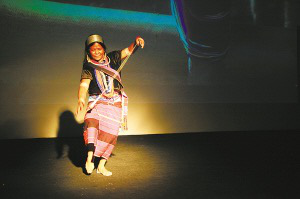 一位佤族婦女登場(chǎng)了。她亮出雄渾的嗓音,唱起佤族古歌。隨即,又上來兩位佤族老人,與她合唱。歌聲越來越歡快,觀眾們的熱情也被點(diǎn)燃,演出廳里的氣氛熱烈起來。