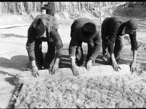 這時(shí),亞生已經(jīng)開始了第二步,他把彈好的羊毛鋪勻,開始噴灑開水。只見他熟練地把水噴向羊毛,然后和妻子一起快速把簾子卷好,用羊毛繩綁緊,再用腳踏著卷好的簾子在平地上來回踏蹬,這樣不停地重復(fù)后,做成了氈坯。亞生停下來解開簾子,拉平氈坯,修整好邊角,又灑上熱開水,把氈坯卷起,這是工藝最關(guān)鍵也是最后一步——他們一起跪在簾上,用雙臂反復(fù)搓滾氈坯,感覺已經(jīng)平整了,夫婦倆又齊心協(xié)力把氈坯展開拉平,放到院子里。此時(shí),亞生長出了一口氣,抹抹頭上的汗說:“晾干了就可以賣了!”
