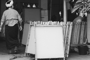 澆紙是在紙槽中進行的,不但需要強勁的臂力,還需要相當?shù)募毿?。在紙槽中舀水的時候,雙臂承受的重量不下10公斤,紙要澆得恰到好處,澆輕了紙就太薄,澆重了紙又太厚。太薄出不了好品相,太厚會增加成本。這是整個構(gòu)紙成品的關(guān)鍵,經(jīng)驗老到的傣族老人,都不會在這道工序上馬虎。一雙手游走在澆紙槽,或輕輕拍打,或慢慢游弋,絮狀的纖維時而附著在手上,時而又歡呼雀躍地散開,頑皮得有點像芒團村水塘邊遇上的那些孩子。憑感覺均勻了,老人這才輕輕將澆紙盤脫離水面,一眨眼功夫,一張構(gòu)紙便在盤上現(xiàn)出端倪。接下來的事就交給陽光了,如果雨季來臨,構(gòu)紙就停止生產(chǎn)。所以說,芒團構(gòu)紙常常浸漬著一種陽光的味道。