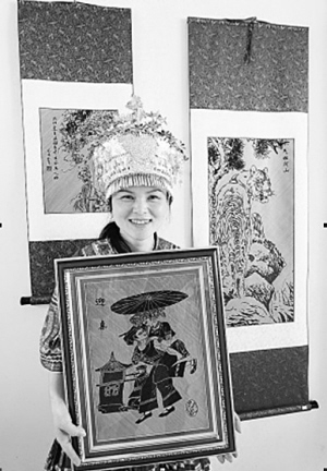一幅幅人物肖像、書法作品、風(fēng)景風(fēng)情畫,工藝精細,造型典雅,誰能想到,它們出自一群苗家留守婦女之手?