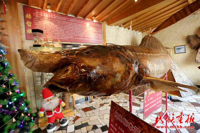 赫哲人把餐廳開(kāi)到了京城,成為向外界展示赫哲族文化的窗口。圖為赫哲族餐廳內(nèi)57歲的大鰉魚(yú)標(biāo)本,體長(zhǎng)2.5米,重達(dá)286斤(陳濤 攝影)
