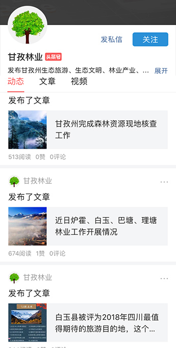 甘孜州林業(yè)局先后啟動甘孜林業(yè)無線站點、甘孜林業(yè)微信平臺、甘孜林業(yè)頭條號及甘孜林業(yè)新浪微博的建設(shè)運營,這些平臺推送均選取編輯與群眾生活息息相關(guān)、群眾喜聞樂見的資訊,旨在打造甘孜州林業(yè)局官方權(quán)威信息發(fā)布渠道,樹立新時代中國林業(yè)新媒體發(fā)展新形象。