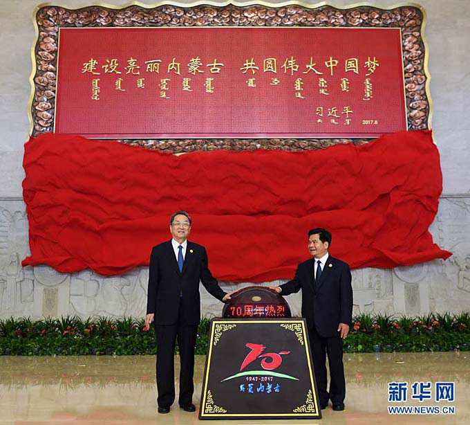 70年來,在黨中央高度重視、關(guān)心關(guān)懷下,內(nèi)蒙古各族人民在革命、建設(shè)和改革的各個(gè)歷史時(shí)期,創(chuàng)造了一個(gè)又一個(gè)人間奇跡,萬里草原發(fā)生了翻天覆地的歷史巨變。圖為8月7日,中共中央政治局常委、全國政協(xié)主席、中央代表團(tuán)團(tuán)長俞正聲率中央代表團(tuán)出席向內(nèi)蒙古自治區(qū)贈送紀(jì)念品儀式,俞正聲和內(nèi)蒙古自治區(qū)黨委書記、人大常委會主任李紀(jì)恒一同為習(xí)近平總書記題詞賀匾揭幕(新華網(wǎng))