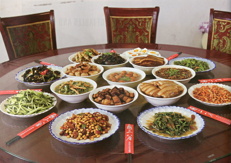 “二八席,八個盤、八個碗,八盤涼菜、八碗熱菜,講究葷素搭配,涼菜以時令蔬菜為主,可隨季節(jié)自由搭配,熱菜相對固定,即為紅木梳背和白木梳背、紅剪子和白剪子?!崩铠P友像說順口溜一樣道出了二八席的基本構(gòu)成。
