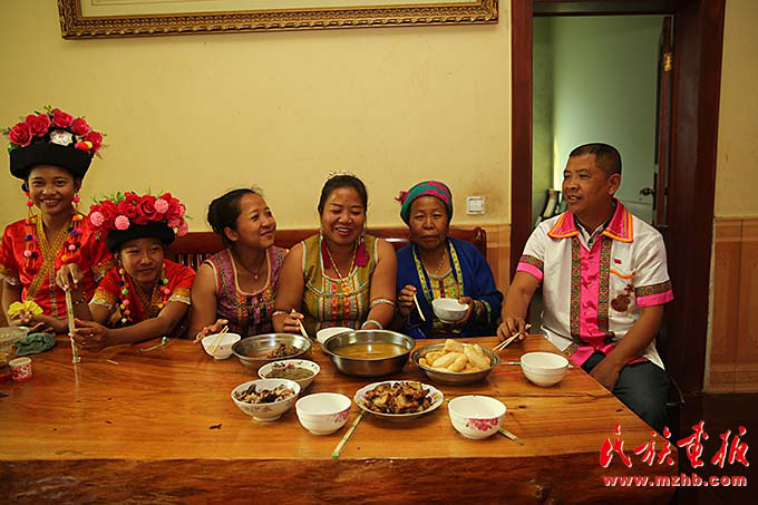 在曼夕村,民族傳統(tǒng)節(jié)日已成為不同民族間聯(lián)絡(luò)增進(jìn)感情的最佳時機(jī)。曼夕村村主任車達(dá)告訴記者,他自己是哈尼族,村里還有漢、布朗、哈尼等民族。40多年前,為了種植橡膠樹布朗族與彝族遷徙過來生活在一起,幾十年來,兩個民族相互尊重對方的生活習(xí)慣,過年過節(jié)相互走動拜訪,互相通婚成為一家人。晚飯時,記者在曼夕村村支書巖坎硝家里聚餐時看到車達(dá)帶著幾個哈尼族婦女盛裝出席,宴會上人們相互祝賀,唱敬酒歌。哈尼族婦女圖處告訴記者,哈尼族過傳統(tǒng)節(jié)日,布朗族村民要來慶賀,布朗族過節(jié),哈尼族人也去祝福,幾十年來一直如此。