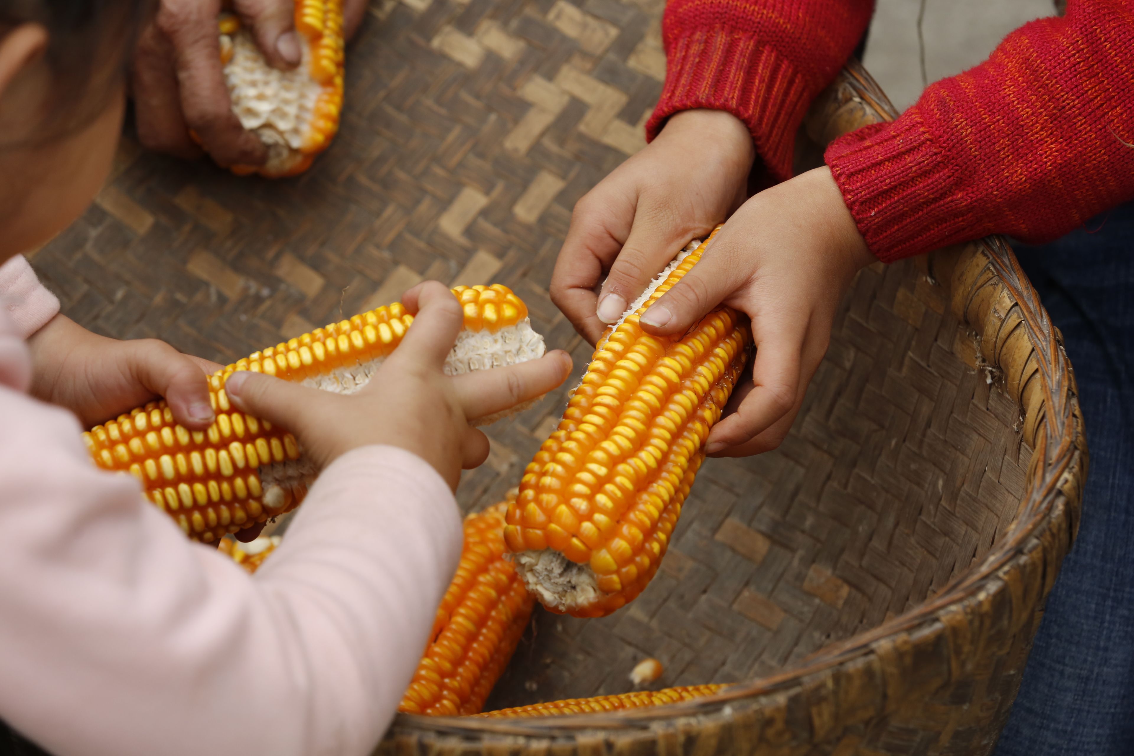 苗族老年人與兒童剝玉米4