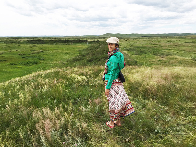 遠(yuǎn)遠(yuǎn)的,一輛嶄新的白色轎車在草原上揚起一陣塵土,然后很快停在我們眼前。一對雍容華貴、穿著蒙古袍的俊男美女從車?yán)镒叱?,在午間強(qiáng)烈的陽光下閃閃發(fā)亮,氣場之強(qiáng)大的令人過目難忘。直到他們熱情地伸出雙手,我們才如大夢初醒般上前拜見。前來的女子正是舒泥,而男子便是我們要拜訪的牧民家的男主人鋼寶勒道。