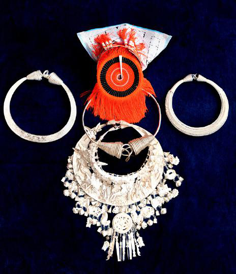 銀飾作為苗族最喜愛的傳統(tǒng)飾物,主要用于婦女的裝飾,品種多樣,分為頭飾、面飾、頸飾、肩飾、胸飾、腰飾、臂飾、腳飾、手飾等,彼此配合,體現(xiàn)出完美的整體裝飾效果。苗族銀飾常出現(xiàn)于苗族的喜慶場合,蘊(yùn)涵有避邪趨正、納福迎祥的寓意,具體生動地反映著苗族人民的生存狀況、精神面貌和審美心理,具有很高的歷史文化研究價值。在對外交往中,苗族人民把銀飾作為禮品贈送友人,和藏族的哈達(dá)、漢族的珠寶一樣珍貴。