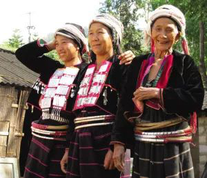 直到今天,腰箍仍在德昂族服飾中占有重要位置。按德昂人的習(xí)慣,姑娘成年后,就要在腰部佩上若干腰箍。這些腰箍大多用藤篾編成,藤圈寬窄粗細(xì)不一,有的漆成紅、黑、綠等色;有的刻上花紋,包上銀皮、鋁皮;還有的一半是藤篾,一半是銀絲。姑娘們以腰箍多、腰箍美為榮。因此,在戀愛期間,小伙子為了討姑娘歡心,往往費(fèi)盡心機(jī)地制作精巧的腰箍相贈。腰箍從傳說的用來“拴住人”,演變成為用來“拴住心”。