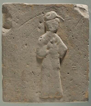 長(zhǎng)30厘米,寬26.5厘米,厚4.5厘米,呈長(zhǎng)方形。畫面中央刻有一位仕女形象。仕女儀態(tài)端莊,發(fā)髻高高盤起,衣著長(zhǎng)裙,雙手抱著一個(gè)長(zhǎng)柄執(zhí)壺,輕移蓮步,徐徐向前,像是要給遠(yuǎn)道而來的朋友斟上一杯家釀的美酒。