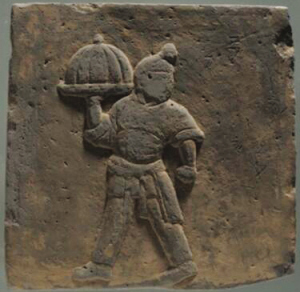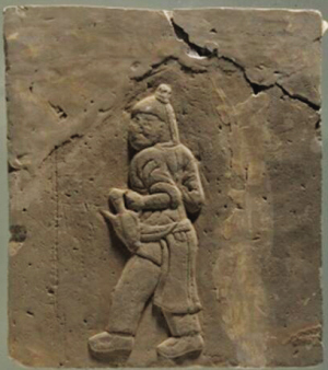 長(zhǎng)30厘米,寬26.8厘米,厚5厘米。畫面中央為一男仆手持壺作行進(jìn)狀。男仆頭戴幘巾,身著翻領(lǐng)長(zhǎng)袍,雙袖卷起至肘部,前襟卷起掖于腰帶上,左手持有蓋長(zhǎng)柄執(zhí)壺,穿長(zhǎng)褲,足穿靸鞋,上身前傾,似乎聽到主人的呼喚,正在匆忙前去斟酒服侍,整體畫面形象生動(dòng)。