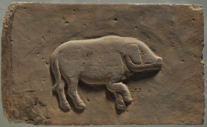 長(zhǎng)30厘米,寬18.5厘米,厚5厘米,呈長(zhǎng)方形。畫面中央為一只側(cè)身的小豬。小豬形象逼真,一只前踢抬起,體態(tài)肥碩,造型可愛,刻畫精細(xì)。