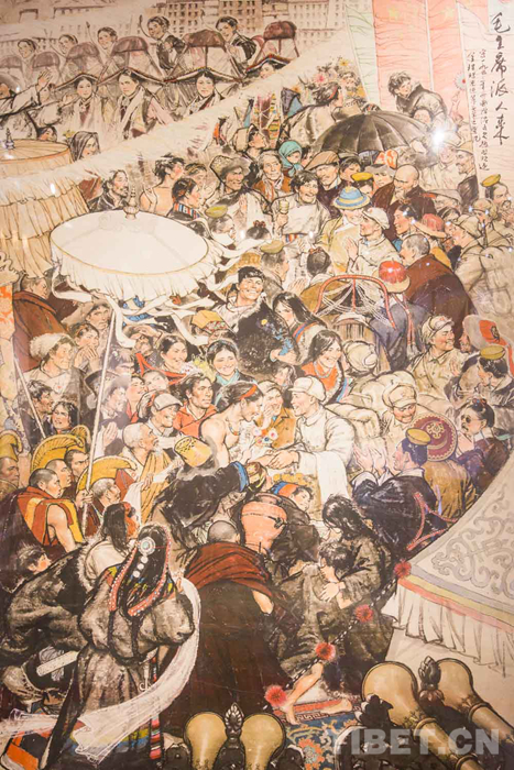 鑒賞展現(xiàn)場,不少前來參觀的畫家都是韓書力的學(xué)生或在一定時(shí)期曾受其教導(dǎo)。“1973年,我在西藏自治區(qū)展覽館見到了韓書力老師,第一次見面我就拜了師。我們一起下鄉(xiāng),我就給他當(dāng)導(dǎo)游和翻譯。30幾年來,我一直在學(xué)習(xí)韓老師的繪畫技法,到現(xiàn)在還是他的學(xué)生。韓老師創(chuàng)作《毛主席派人來》時(shí),我就跟在旁邊學(xué)習(xí)。學(xué)到了一些創(chuàng)作獨(dú)幅作品的技巧和手法,讓我受用至今?!蔽鞑厍嗄戤嫾矣?jì)美赤列說。