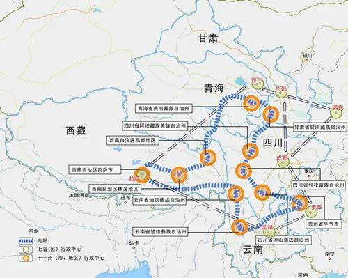 藏羌彝文化產(chǎn)業(yè)走廊依托的城市樞紐包括:四川省成都市、貴州省貴陽(yáng)市、云南省昆明市、西藏自治區(qū)拉薩市、陜西省西安市、甘肅省蘭州市和青海省西寧市。