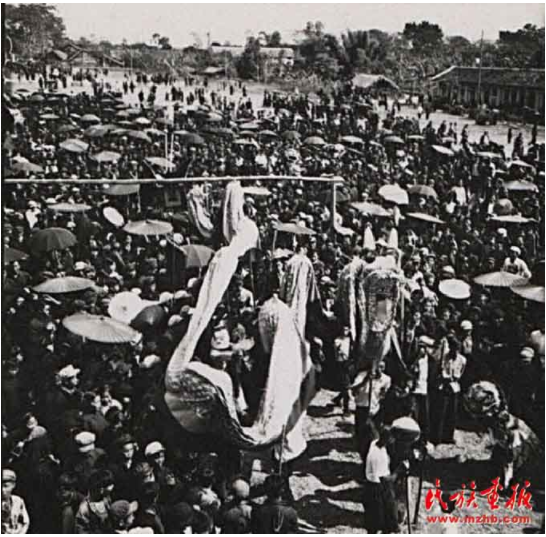 “歌圩”是桂西壯族古老的風(fēng)俗。每年農(nóng)歷正月、二月、四月都有歌圩日。圖為1957年廣西壯族自治區(qū)憑祥市郊區(qū)的歌圩日,這里不但處處歡歌笑語(yǔ),還有搶花炮、演壯戲、舞彩龍、舞彩鳳、唱桂劇等很豐富的文娛活動(dòng)
