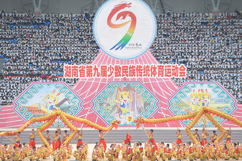 金風(fēng)送爽,丹桂飄香。10月16日至20日,湖南省第九屆少數(shù)民族傳統(tǒng)體育運(yùn)動(dòng)會(huì)在龍山縣舉行。本屆運(yùn)動(dòng)會(huì)以“龍山緣·民族情·中國夢”為主題,由省民宗委、省體育局、湘西州人民政府主辦,龍山縣人民政府承辦,共有來自湖南省14個(gè)市州和17個(gè)民族縣市區(qū)組成的31個(gè)代表團(tuán)2631人參加,是湖南省歷屆少數(shù)民族傳統(tǒng)體育運(yùn)動(dòng)會(huì)規(guī)模最大、規(guī)格最高、參賽人數(shù)最多的一次。運(yùn)動(dòng)會(huì)期間,來自土家、苗、瑤、侗、白、維吾爾、壯、回、漢等22個(gè)民族的1991名運(yùn)動(dòng)健兒角逐高腳、秋千、板鞋競速、射弩、陀螺、蹴球、押加、毽球以及民族健身操9大項(xiàng)60個(gè)小項(xiàng)的競賽項(xiàng)目以及55個(gè)表演項(xiàng)目。