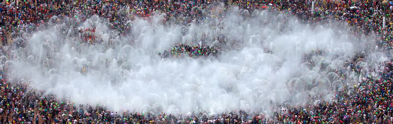 “??氨冗~”即傣歷新年節(jié)。傣歷一般以6月為首,5月為末。每年的新年是太陽(yáng)沿黃道十二宮運(yùn)行至白羊?qū)m之日,此時(shí)多為傣歷6月,所以有“楞賀??氨冗~傣”即“傣歷6月新年節(jié)”之說。新年到來,傣族人民都要舉行最隆重的“趕擺”慶祝活動(dòng),一般為3-4天。第一天為舊年最末一日,傣語(yǔ)稱“宛多桑堪”,即除夕;傣歷舊年與新年之間往往有1-2天的“空日”,傣語(yǔ)稱“宛腦”,既不是舊年又不是新年的日子;隨后才是新年元旦,傣語(yǔ)稱“麥帕雅宛瑪”,即“日子之王來到的日子”。新年間,各村各戶殺豬宰牛,做米干、米線,穿新衣、新褲,參加慶祝大會(huì)和“趕擺”活動(dòng)。期間,在各村各寨的佛寺里都要舉行隆重的 “沐佛”活動(dòng),“沐佛”活動(dòng)結(jié)束后,人們用純凈的水相互潑灑,相互祝福。這一活動(dòng)慢慢演變和發(fā)展,形成了今天的“潑水狂歡”活動(dòng)。屆時(shí),成群結(jié)隊(duì)的民眾走上街頭,參與相互潑水祝福的狂歡活動(dòng),熱鬧非凡。因此,人們又把傣歷新年節(jié)稱為“潑水節(jié)”,“潑水節(jié)”就變成了傣歷新年節(jié)的代名詞。