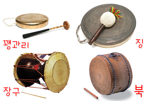 “四物樂(lè)”,朝鮮語(yǔ)為????。四物樂(lè)是由韓國(guó)著名民俗家沈雨晟先生命名的,20世紀(jì)90年代傳入我國(guó)吉林延邊朝鮮族自治州。“四物樂(lè)”由小鑼(???)、鑼(?)、長(zhǎng)鼓(??)、圓鼓(?)四種樂(lè)器演奏音樂(lè),并且由此音樂(lè)來(lái)做游戲。每種樂(lè)器都是以大自然的聲音來(lái)形成的。小鑼象征風(fēng),長(zhǎng)鼓象征雨,圓鼓象征雷,鑼象征電。
