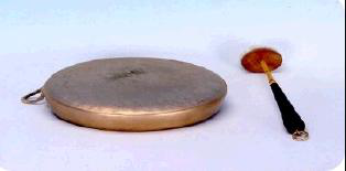 與小鑼相似但比小鑼要大,通常為面徑70CM,邊圈高10CM,邊穿小孔,用繩索固定。演奏時(shí),左手提繩,右手拿錘演奏;盤坐演奏時(shí)大鑼懸掛在木架上,可以用手來(lái)控制音色,其聲音洪亮、粗獷。