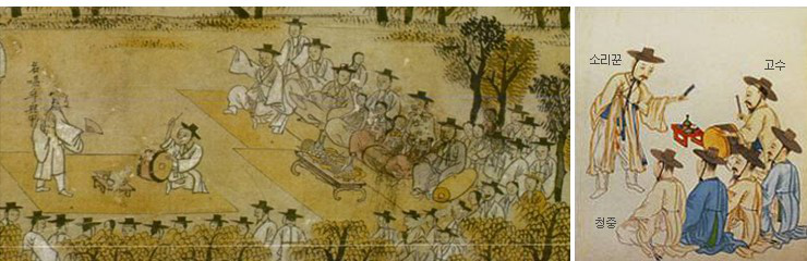 盤嗦哩通常由一人演唱,另一人用鼓伴奏。這種形式大約在18世紀(jì)中朝鮮王朝后期開始出現(xiàn),19世紀(jì)末是它的黃金時代。關(guān)于它的起源有兩種不同的看法,一種認(rèn)為它是18世紀(jì)的游浪藝人根據(jù)某種戲劇創(chuàng)造的,另一種則認(rèn)為是來源于薩滿教儀式中的歌曲。盤嗦哩的故鄉(xiāng)是韓國全羅北道的南原,至今那里仍盛行這種演唱。