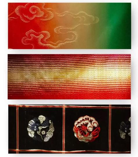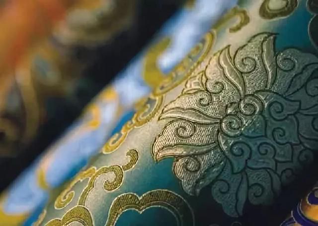 民族錦一般采用多色彩條嵌入金銀絲織成,多用于民族服飾,故名。其特點是錦面上的圖案從經緯線交織中顯現出自然光彩,富有光澤。常見的圖案有團花、葵花、“萬”字“壽”字等。彩暈錦的特點是織紋華貴相映,明暗匹配,層次分明,并以色暈過渡,花紋絢麗多彩,別具一格。