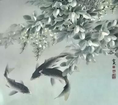 魚是蜀繡中的代表圖案。該繡品針?lè)?xì)膩,片線光亮,色彩典雅。紫藤花與水中的鯉魚動(dòng)靜結(jié)合,相映成趣。