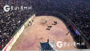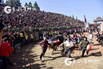 貴州省從江縣第十五屆原生態(tài)侗族大歌節(jié)的前一天,恰逢該縣逢亥斗牛日,丙妹鎮(zhèn)松學(xué)斗牛塘、谷坪鄉(xiāng)四寨河斗牛塘同時(shí)舉辦傳統(tǒng)牛王爭(zhēng)霸賽,喜迎一年一度“侗族大歌節(jié)”的到來,共有來自周邊村寨的80頭水牯牛參戰(zhàn),斗?;顒?dòng)場(chǎng)上名牛角逐,場(chǎng)面異彩紛呈,吸引數(shù)萬(wàn)名觀眾前來觀戰(zhàn)。