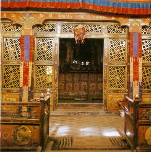 大門由于它的位置所在不應(yīng)該列入室內(nèi)裝飾,但它與室內(nèi)裝飾息息相關(guān),連成一體,故我們把它當(dāng)作室內(nèi)裝飾在這兒加以介紹。門框裝飾包含門框本身、門楣、門楣上的屋檐、門板等。藏族建筑大門裝飾十分講究,從屋檐到門坎都用雕、繪的手段充分加以裝飾。屋檐用兩道方本間隔排列,上蓋青石片和黃土筑成底小頭大的形狀,它不僅有美觀的裝飾效果,而且起到防水作用。屋檐下是門楣,門楣上彩繪各種圖案,門框的木構(gòu)件上雕刻蓮花花瓣和累卷疊函凹凸方格圖案,這種圖案處理形式大部分民居大門大同小異。門板為單開式,板門為了加固起見上、下分層釘鐵條。門板一般涂單一色,不作繪畫處理。除了這些裝飾以外,門相上掛短縐簾,門框左右邊緣墻上涂兩道黑色豎條,每年過年前短縐簾要棄舊換新,黑色豎條與粉刷外墻一道重新涂漆,這是一般民居門框裝飾。寺廟門框裝飾較為復(fù)雜,門楣的間隔方木上加一層雕刻動物頭像的木雕作品排成一行,裝飾門楣這一板塊,門框木構(gòu)件多則六、七層,層層雕刻各種圖案,可見其講究程度。寺廟門板大多是對開式,用鐵條包裝門邊緣,中間分層釘鐵條,涂一層單一的顏色,特殊殿堂如擴(kuò)法神殿大門門板上要進(jìn)行繪畫處理,寺廟大門講究厚重、莊嚴(yán)。無論是民居大門還是寺廟大門,其裝飾要求與室內(nèi)梁柱裝飾相協(xié)調(diào),從顏色的運(yùn)用到雕刻內(nèi)容都要做到這一點(diǎn),保持內(nèi)外裝飾效果統(tǒng)一。