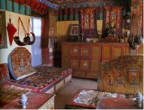 藏族民居室內(nèi)裝飾講究工整、華麗、亮堂,上至天花板下至與地板相接的墻角都采用雕刻、彩繪等藝術(shù)手段加以裝點(diǎn),尤其是橫梁、柱頭和大門等木結(jié)構(gòu)空間是充分展示裝飾才能的地方,在這里裝飾效果盡其所能。此外寺廟重點(diǎn)佛堂,回廊墻壁上繪制彩畫,這也是一種重要的裝飾手段,而百姓居室內(nèi)的墻壁上用繪制花卉、彩條來取得裝飾效果。