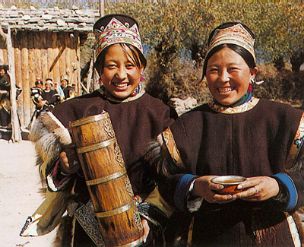在工布地區(qū),不管是遠方的來客,還是常來常往的朋友,一踏進主人的新家,主人首先端出的是香噴噴的酥油茶。如果是尊貴的客人,還要被請到上座。招待來客時,主人會敬上酥油茶和青稞酒,尤其是青稞酒,主人要兩手棒著,恭敬地送到客人手上,客人喝一口,主人添一次,連續(xù)三次。客人最后一口氣把杯中的酒喝完,這就是通常所說的三口一杯。如果客人推辭,主人還要獻上優(yōu)美動聽的酒歌,以此來表達主人的熱情和對客人的尊敬,直到客人把杯中的酒喝完為上。手捧酒杯,主人依次要給所有的來客敬上一遍。杯杯醇酒,盛滿了工布人的情和意。那情景,常令在場的人感動不已。