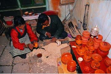 木碗的來源,一是西藏自己生產(chǎn)的,還有一種是云南迪慶生產(chǎn)的,都是從西藏的市場上交換或購買的。西藏林芝地區(qū)的朗縣、察隅,山南地區(qū)的加查、隆子、錯那,阿里地區(qū)的噶爾等地均產(chǎn)木碗。其中尤以錯那生產(chǎn)的“察牙”木碗和噶爾生產(chǎn)的“堆旭”木碗最負(fù)盛名。以上木碗的原料選擇樹根或樹瘤車制而成,選料之講究,做工之精細(xì),使好木碗的花紋各異,或磷火紋,或豬鬃紋,或貓頭鷹眼紋,這些木碗都很名貴,與普通木碗之間的價格也很懸殊,一個上等木碗價值10頭牦牛,一般人家是不敢問津的,但也盡量想方設(shè)法弄個像樣的,以慰平生。