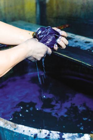 制作女子盛裝服飾是最復(fù)雜的,黎鳳珍需要先將粘膏在白布上畫出裙邊圖案和背心圖案。染布時(shí),她要上山割蕨草,再摻雜一些不知名的草,燒成灰,隨后過濾,用過濾后的水與適當(dāng)比例的藍(lán)靛和酒混合,攪拌均勻,最后制成染布的水??椇玫陌撞?,要上山挖一種植物的果實(shí)——“多亞”果,進(jìn)行浸染,一般在每年的七八月進(jìn)行。洗凈挖來的“多亞”果切成片煮沸后,把布放入湯中浸泡,撈出后在烈日下曬干,這一環(huán)節(jié)需要不斷地重復(fù)進(jìn)行。