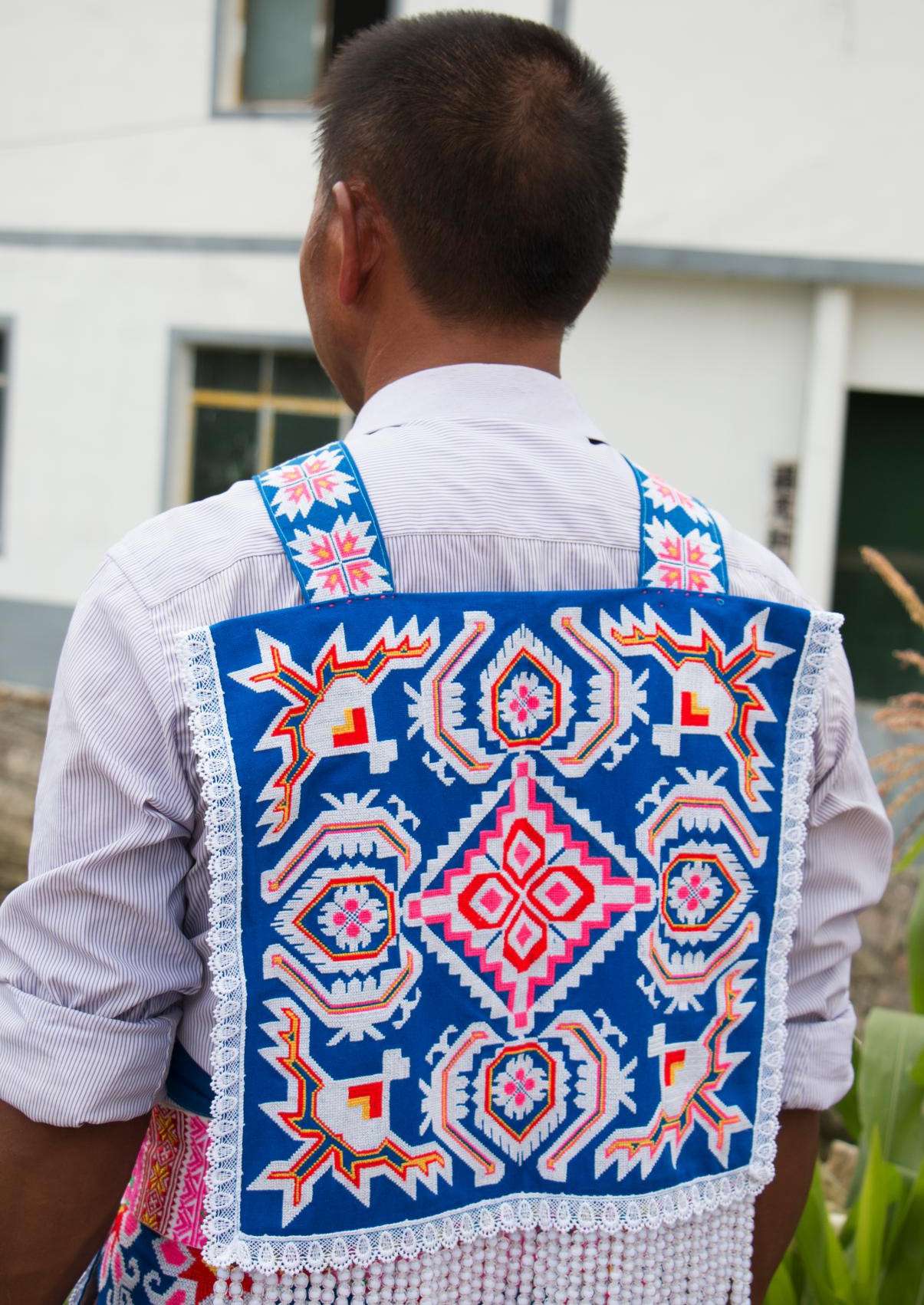 谷立村男子服飾相對于苗族女子服飾則顯得較為簡樸,男子上身主要穿著白色打底的對襟衣,身后背有背牌,背牌底色為藍(lán)色,上繡有花朵圖案作為裝飾。下身主要以藍(lán)色打底的圍裙為主,身前圍裙,上面布滿刺繡圖案。身后的圍裙則為一條條獨(dú)立的絲帶,絲帶上同樣布滿花紋刺繡圖案,在其底部還串有珠簾作為裝飾。