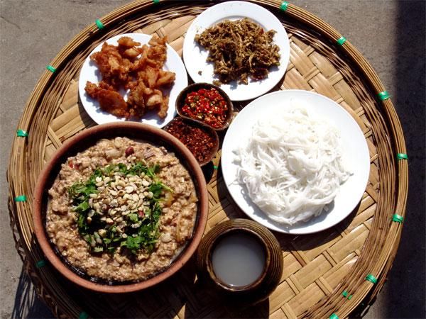 阿昌族還喜歡吃竹筍、竹蛆和蜂蟲、蜂蛹等。竹筍的吃法有鮮竹筍、干竹筍、腌酸筍等。鮮竹筍肉嫩細(xì)香,可當(dāng)蔬菜,也可與肉、豆類等炒著吃。竹蛆是一種生在嫩竹中的蟲蛹,色白個大,肉肥細(xì)嫩。有時一節(jié)竹子中有數(shù)百條,取出后用油炸脆,色澤金黃,撒點鹽而吃,是一種高蛋白鮮美食品。食用的蜂蟲、蜂蛹主要有黃腰蜂、夜時蜂、草蜂等土蜂類的蛹和幼蟲?;蛘ɑ虺矗愦嗫煽?,營養(yǎng)豐富。
