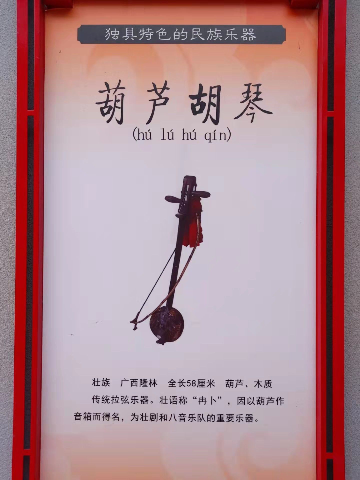 傳統(tǒng)拉弦樂器。壯語稱“冉卜”,因以葫蘆作音箱而得名,為壯劇和八音樂隊(duì)的重要樂器。