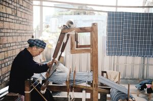 望謨縣布依族的土布按用途和制作工藝大致可分為兩種:純色布與格子花布。前者是先把棉線織成白布,然后放入染缸,染成深淺不同的藍(lán)度。布依族尚黑,老人愛穿黑衣,顯得莊重,年輕人一般穿淺一點(diǎn)的藍(lán)色。因?yàn)槭琴N身衣物,質(zhì)地相對細(xì)軟。格子花布則略厚韌一些,要先將棉線染成深藍(lán)、中藍(lán)、淺藍(lán)、灰、深灰、青等顏色,再上織機(jī)織出不同的格子紋樣,也有做條紋的。這種布通常需要五幅拼在一起做成床單,夏天躺上去,尤其是在通風(fēng)性沒那么好的水泥樓房里,就像睡在竹席上一樣清爽,一整夜都不會(huì)濕汗,同時(shí)又沒有竹席的冰涼。等到冬天,它又暖和貼身,十分好睡。另外還有一種婦女用來包頭的格子布,摸上去軟和些。