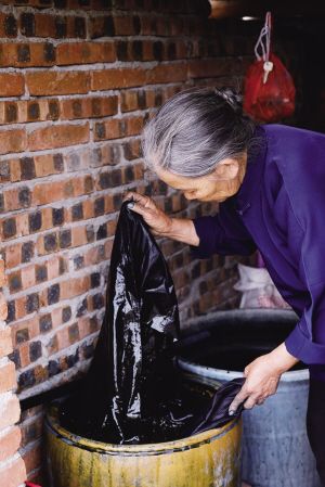 黃奶奶帶我去看她染布的地方,屋頂一間小小的屋子里擺了三個(gè)大缸,還沒走近就聞到濃烈的藍(lán)靛發(fā)酵所產(chǎn)生的獨(dú)特氣味。染缸用厚厚的布蓋著,如同黃奶奶的秘密寶箱,要掀開才能看到里面深色的液體?!敖裉觳怀桑麓稳静冀o你看。”她看了看液體表面,也沒多說,似乎染缸有它自己的節(jié)奏。