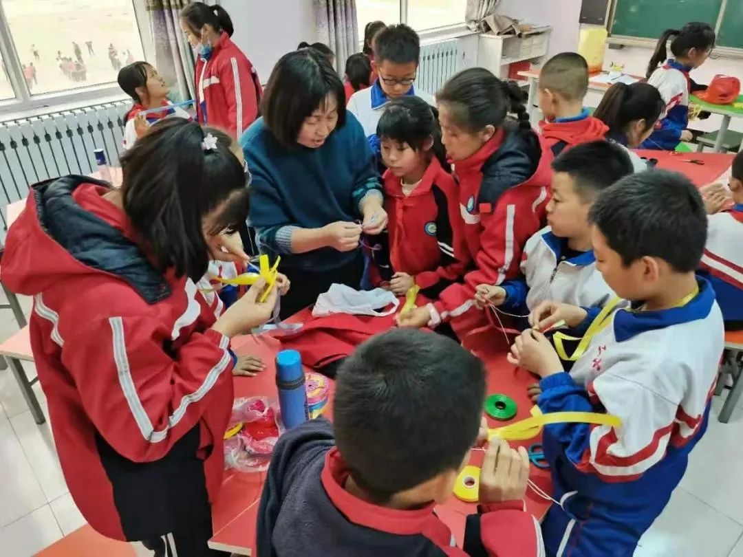 葛玉英說(shuō):”芨芨草手工編織品主要有簍、筐、盒、盤(pán)、茶墊、時(shí)尚包等生活用品,色彩以白、藍(lán)為主,圖案以白云紋、曲字紋為主,以針繡法結(jié)合草編中的平編、絞編、編花、纏邊、擰編等技法進(jìn)行編織。在實(shí)際教學(xué)中,為了方便,我用彩帶代替芨芨草,讓芨芨草編織技藝在孩子們的濃厚興趣中得到傳承,既提高了學(xué)生的動(dòng)手能力,也提升了學(xué)生的審美思維和審美能力,同時(shí)增強(qiáng)了學(xué)生對(duì)本土文化的自豪感和自信力。”