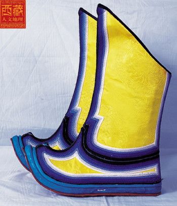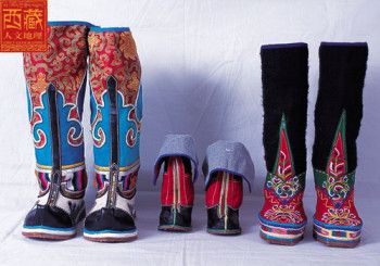 西藏高原地域遼闊,每個(gè)地區(qū)都有屬于自己的鞋子。藏族男女鞋,外觀雖然很像舞臺(tái)上古裝戲里穿的靴子,但用牛皮做底,底高二寸,腰高至小腿之上,鞋面用紅綠相間的毛呢裝飾,鞋腰也有線條、花紋,鞋幫用各色絲線或各色皮革、氆氌、金絲緞制成。人們能從一個(gè)人所穿的鞋子判斷出一個(gè)人的職業(yè)和社會(huì)階層。
