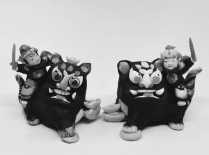 泥叫虎是山東高密的一種民間泥塑,起源于明代萬歷初年,是形、色、聲、動俱佳的民間工藝品,與撲灰年畫、剪紙并稱為“高密三絕”。泥叫虎腰部由牛皮連接,擠壓其頭部和尾部后,會發(fā)出響聲,叫虎一名由此而來。河南也有叫虎,又稱皮老虎。相較之下,山東的泥叫虎更具特色,而且在藝術(shù)風格上更大氣,樣式憨態(tài)可掬,哨子發(fā)出的聲音也十分有趣。
