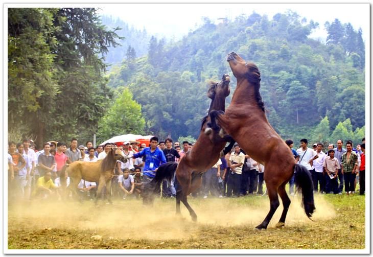 斗馬節(jié)這一天,縣城笙歌震天,鐵炮、粉槍齊鳴。穿著節(jié)日盛裝的各族群眾興高采烈,跳起歡快的蘆笙踩堂舞。這時精神抖擻的苗家馬主,牽著各自的馬匹,從四面八方云集斗馬場。先由馬主拈鬮分組初賽,兩兩相斗,出線者參加復(fù)賽和決賽,決出最后名次。對獲勝者評出一、二、三名,給戰(zhàn)馬披紅掛彩。