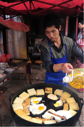 當(dāng)天上午,在拍攝好平壩古鎮(zhèn)之后,我們一行首先來(lái)到位于老街的馬曉忠家,他家的房子雖然街面不寬,但是進(jìn)深有30多米,全都堆放著加工用的工具,記者發(fā)現(xiàn),慕名而來(lái)品嘗小吃的人不少,還有些則是打包帶走,主人正在忙著煎豌豆粉和臭豆腐,他家平均每天要各加工60斤左右的豌豆和50斤左右黃豆,到了冬臘月間,就要做得更多了。沒(méi)有請(qǐng)小工,全靠夫妻兩二及小女下班后來(lái)幫幫忙,打打下手。馬曉忠說(shuō),制作過(guò)程非常辛苦,天不亮就開(kāi)始,再加上做臭豆腐,基本一天中很少有閑著的。