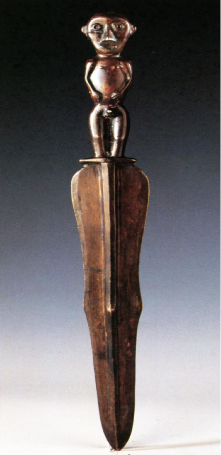首先是對當(dāng)?shù)匦率鲿r代文化因素的繼承和延續(xù),以男女立人形青銅短劍為例,其圓雕人像造型,是對遼西地區(qū)人形雕塑傳統(tǒng)的繼承。與小河西文化陶塑人頭像、興隆洼文化石雕人像、趙寶溝文化陶塑人頭像、紅山文化陶塑人像、小河沿文化人形陶壺等一脈相承,雖然人像造型和載體略有不同,但未曾間斷,體現(xiàn)了遼西地區(qū)史前文明的祖先崇拜和宗教祭祀禮儀傳統(tǒng)的延續(xù)性。人像造型既是禮制的最高呈現(xiàn),同時具有標(biāo)志身份和地位的功能。
