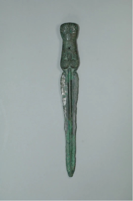 第四,夏家店上層文化中大量的游牧和騎馬民族文化因素,應(yīng)是晚商以來,伏爾加河流域的塞伊瑪文化經(jīng)南西伯利亞、外貝加爾地區(qū)的卡拉蘇克文化和塔加爾文化到達(dá)蒙古高原和中國北方長城地帶,形成諸青銅文化,繼而進(jìn)一步向東方推進(jìn),抵達(dá)夏家店上層文化。其中受長城地帶柄身連鑄匕首式短劍影響,形成夏家店上層的銎柄直刃劍,各種動物雕塑形象也被吸收借鑒,在夏家店上層廣泛流行開來。