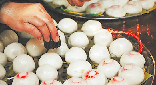 齋是將紅糖味的熟糯米包入糯米漿制成的皮里,口感香糯有韌性。除了蒸熟后直接食用,齋還有一種特殊的吃法:將其對(duì)半切后,用油稍微煎過再加紅糖水,煮成一碗甜香四溢的紅糖齋。