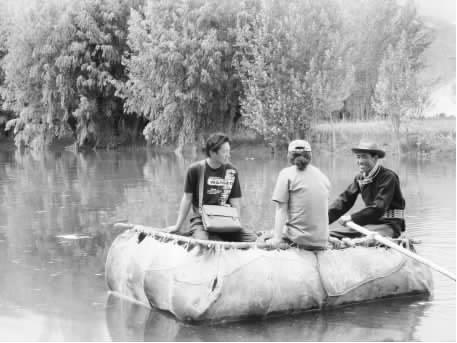 據(jù)當(dāng)?shù)厝私榻B,牛皮船構(gòu)造簡單,用木頭做船架、牛皮做船體。首先采用比較堅硬有彈性的樹木來做骨架,然后把牦牛皮泡在水里,將皮上的毛和肉全部去掉后,用四張牛皮并對縫起來,趁牛皮軟時包在骨架上,同時用牛皮繩子捆緊繃好、曬干、擦油定型,再在牛皮接頭處采用牛、羊油來堵住縫口密封好,避免進(jìn)水。