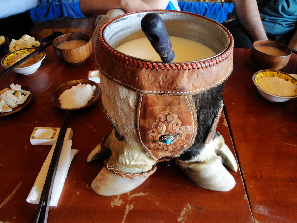 奶茶(蒙語叫“蘇臺柴”)是蒙古民族日常飲用的一種茶,也是蒙古人民招待客人的必備飲料。其做法,一般是將磚茶放入鍋內(nèi)熬成紫紅色,然后將鮮奶(除常用的牛奶外,還用羊奶或駝奶)大致以六比一的比例放入茶水中熬開,即成。隨其所好,可加鹽或加糖。奶茶營養(yǎng)豐富,具有提神、開胃、助消化、解渴等功效。
