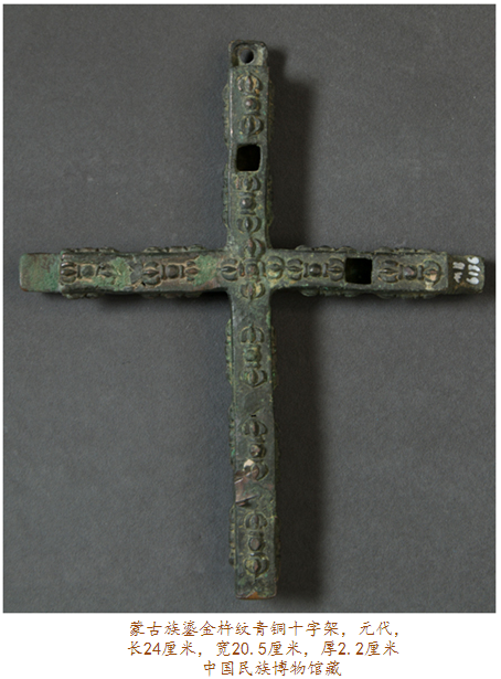眼前此件在內(nèi)蒙古達茂旗出土的元代鎏金青銅十字架,四面排列有浮雕金剛杵紋,其正面每個金剛杵圖案上均有鎏金裝飾,十字架上部穿孔則可用于懸掛。金剛杵是藏傳佛教里的修行法器,象征力量與智慧;而十字架則是基督教文化的標志,如此混搭,歷史便要傳遞出種種:在信仰藏傳佛教的蒙古高原,金剛杵,象征無畏圓滿,十字架,則代表救贖重生,東西方文化的結(jié)合亦呈現(xiàn)某種文明可能達到的無可比擬之高度。