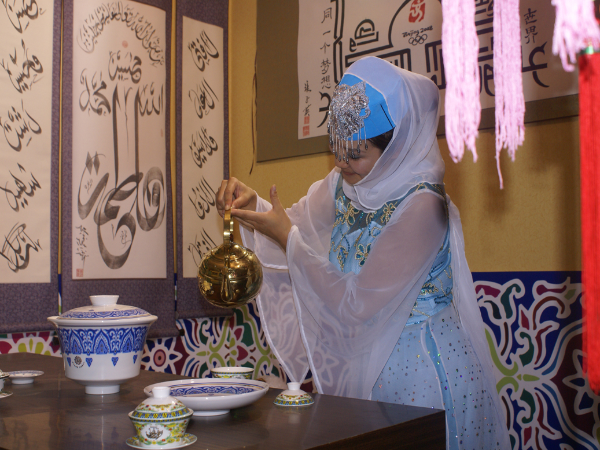 回族飲料非常講究,凡是不流的水、不潔凈的水均不飲用。無論西北東北或西南,也無論是城鎮(zhèn)或農(nóng)村,只要到回族家做客,熱情的主人都會首先端上一碗熱騰騰的釅茶?;刈逡埠苤v究茶具,不少家庭都備有成套的各式各樣的茶具。過去煮茶或沏茶所用的壺,一般都由銀和銅制做,形式多樣,別具一格,有長嘴銅茶壺、銀鴨壺、銅火壺等?,F(xiàn)在沏茶一般都用瓷壺、蓋碗或帶蓋瓷杯,煮茶多用錫鐵壺,夏天講究用紫砂壺。